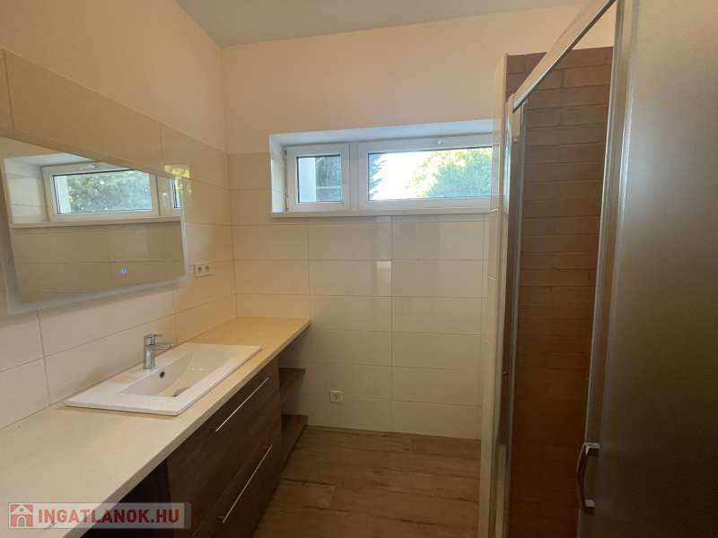 A földszinten található még egy tágas hálószoba, egy zuhanyzós fürdőszoba, ahol mosógép elhelyezésére is van lehetőség, illetve egy külön bejáratú WC.