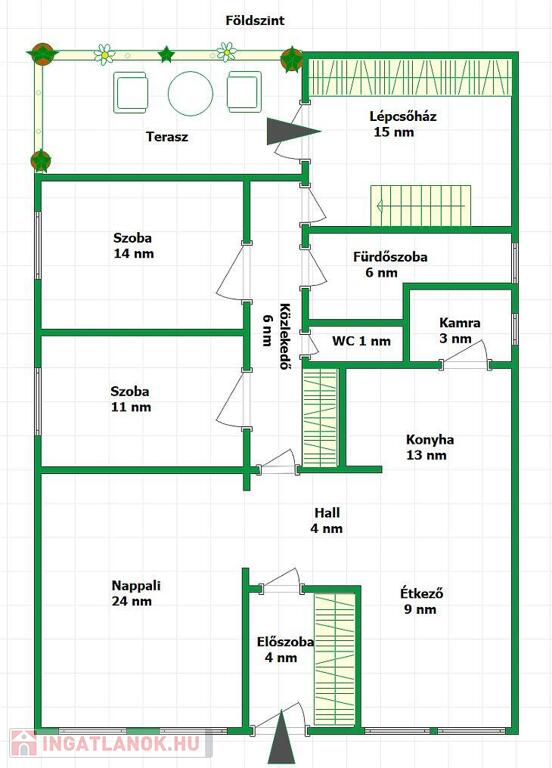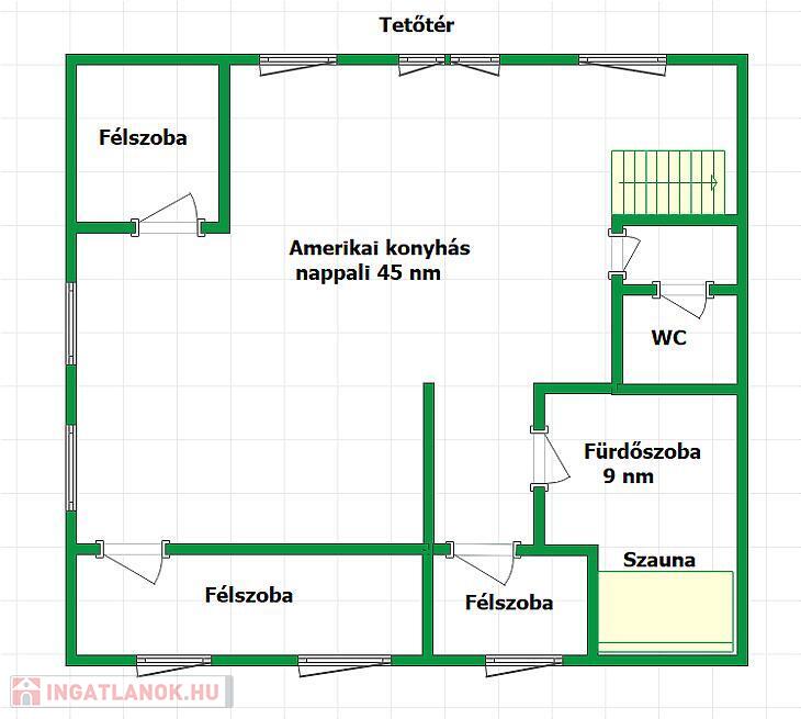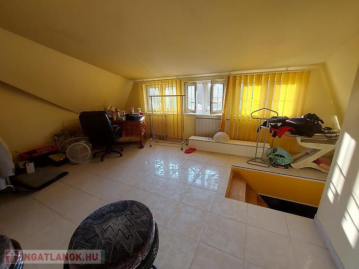 A földszinten található egy nappali, két hálószoba, konyha, kamra, étkező, előszoba, hall, közlekedő, fürdőszoba, külön WC, valamint egy lépcsőház és egy fedett terasz is továbbá a tetőtérben van egy amerikai konyhás világos nappali, három félszoba, egy szaunával felszerelt fürdőszoba és egy WC.