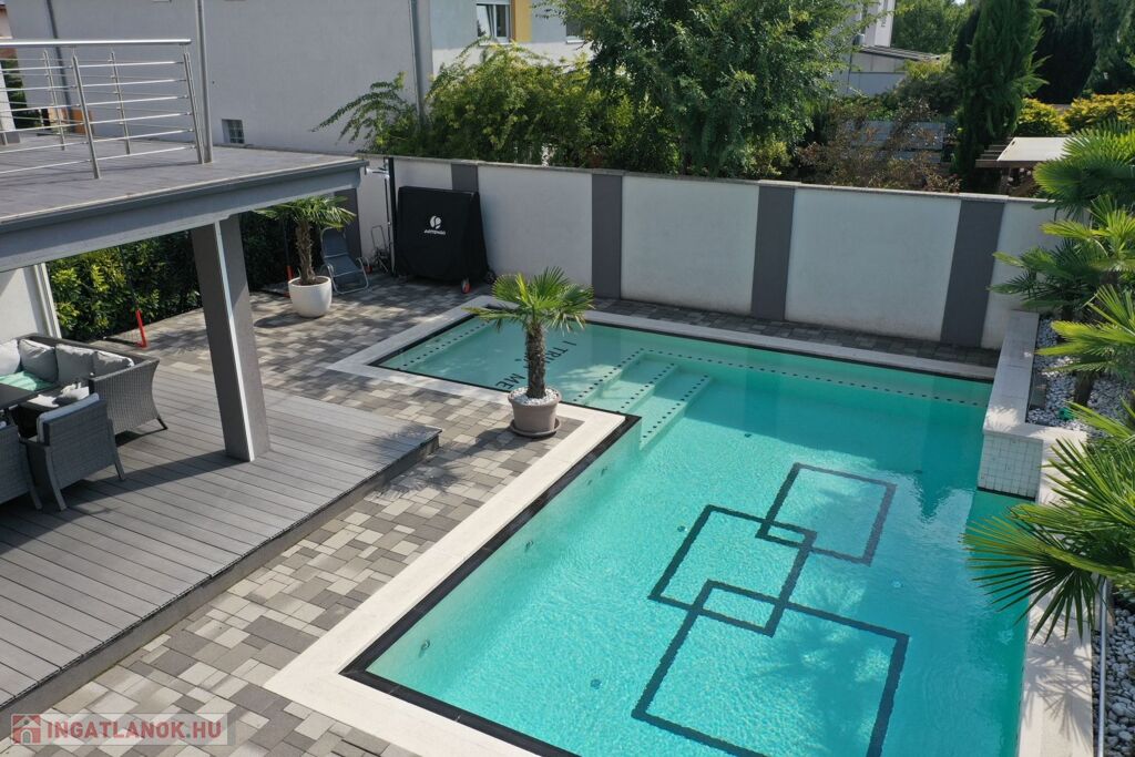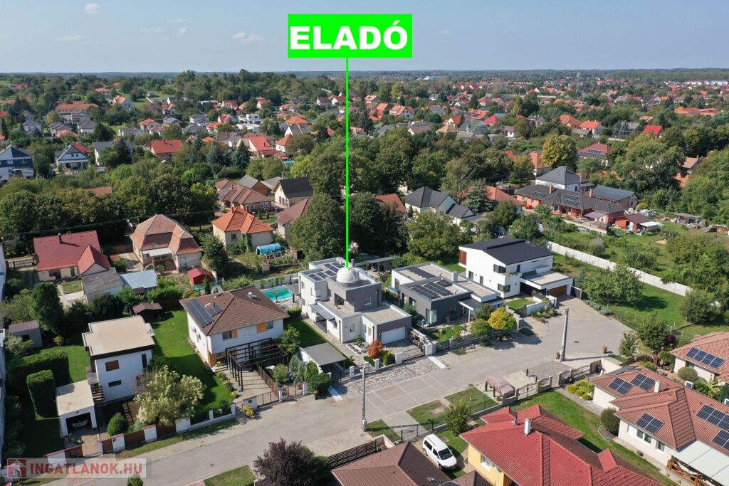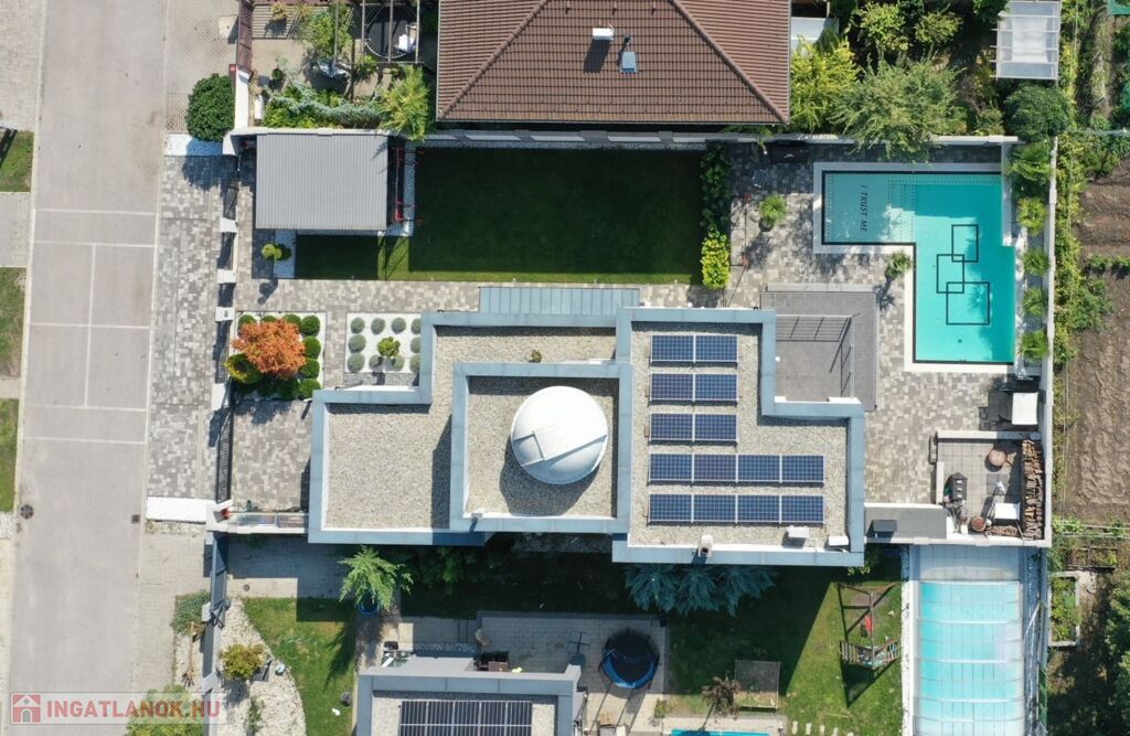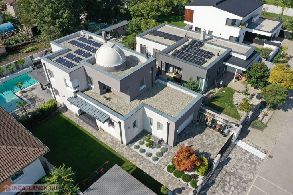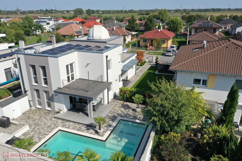 Győr-Ménfőcsanak nyugodt részén, új építésű lakóházak között, 540 m2-es telken, 2014-ban épült, 171 m2-es, nappali plusz 4 szobás lakótérrel, 61 m2-es terasszal, erkéllyel, 30 m2-es garázzsal, 20 m2-es fedett gépkocsi beállóval, 65 m2-es medence térrel, csillagvizsgálóval rendelkező lakóház eladó.