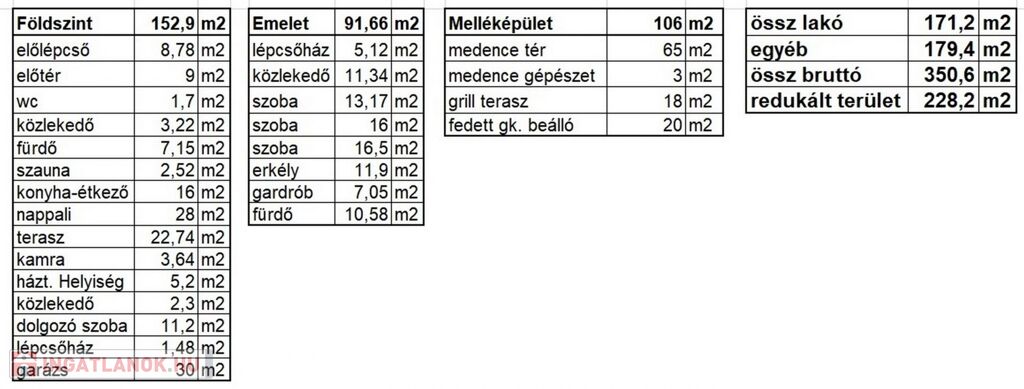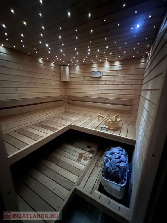 Az ingatlan alaprajzai és helyiséglistája a fotók között található, amiből látható az átgondolt térszervezés. A földszinten a nappalin - ahonnan a földszinti fedett teraszra érkezünk - és az étkező-konyhán kívül, amik egy légteret alkotnak egy lakószoba kapott helyet. Az említett szauna a zuhanyzós fürdő szobában található. A földszinten egy önálló és egy a mosókonyhában elhelyezkedő wc található.