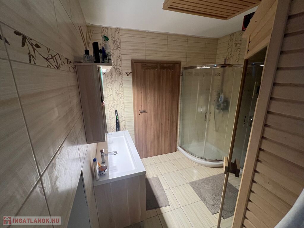 az emeleten három hálószobán kívül egy kádas, zuhanyzós fürdőszoba, valamint egy a fő hálószobából - ahonnan az emeleti teraszra is kijuthatunk - megközelíthető gardrób szoba helyezkedik el.