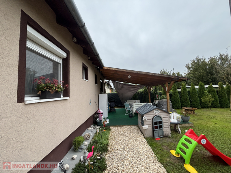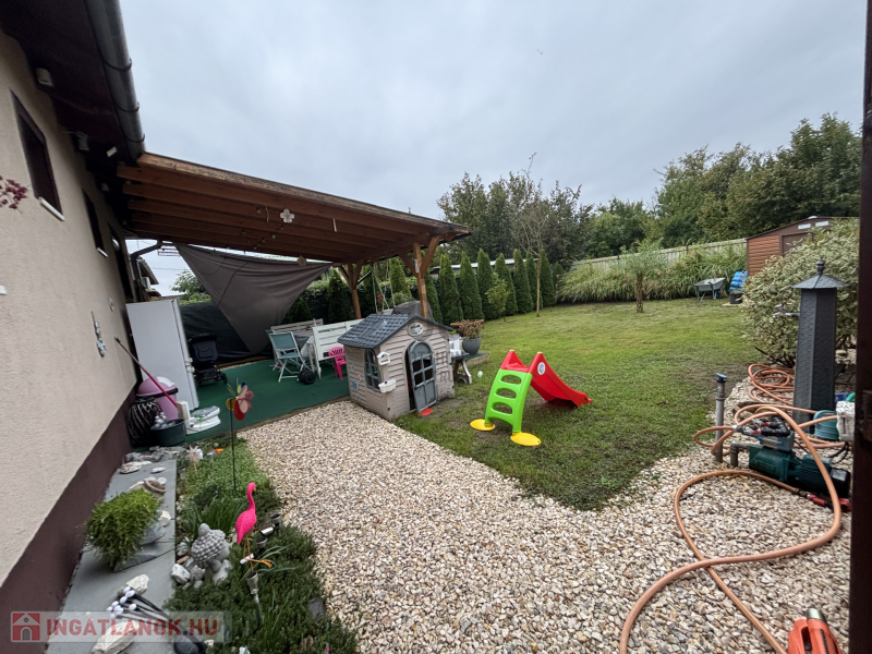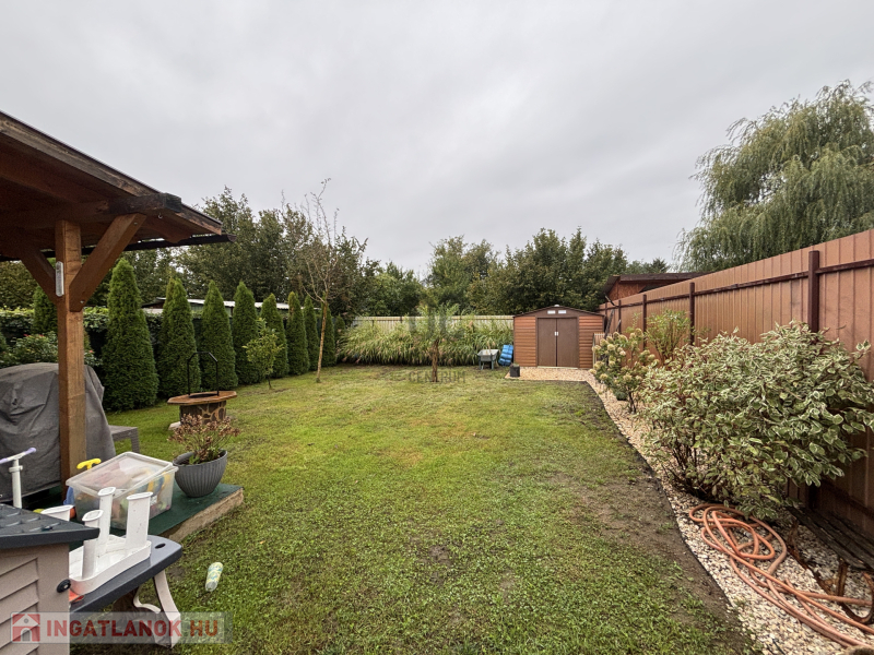 A házhoz tartozik egy hangulatos terasz, amely tökéletes helyszín a pihenéshez vagy családi, baráti összejövetelekhez. A gondozott kert zöld környezete igazi otthonosságot biztosít, míg a tároló kényelmes megoldást kínál kerti és háztartási eszközök elhelyezésére.