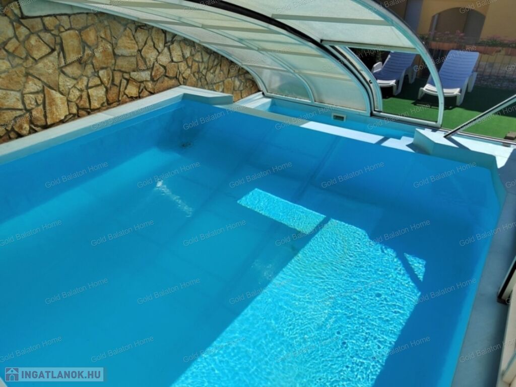 - 2 úszómedence az udvaron napozó terasszal, a nagy medence mérete: 4*4,6 m, 1,35 mély, a kis medence 2,3*4,6 m, 0,6 m mély