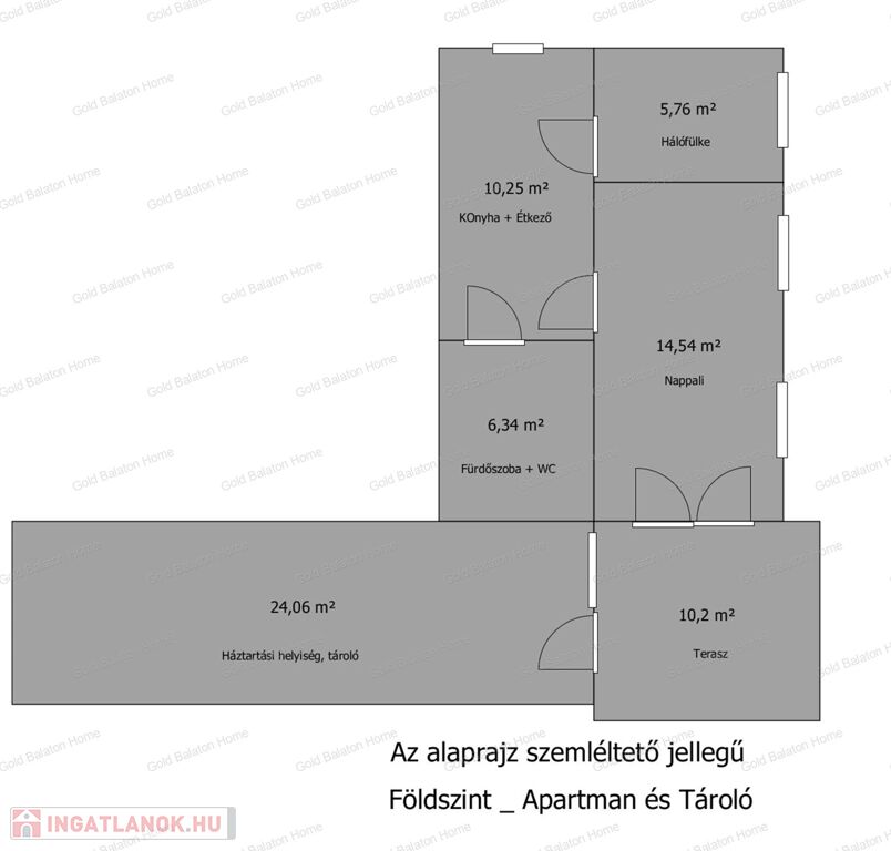 - földszint - 42 nm: konyha -étkező, 1 nappali, 1 hálófülke, fürdőszoba káddal és WC –vel, külön bejáratú tároló 24 nm