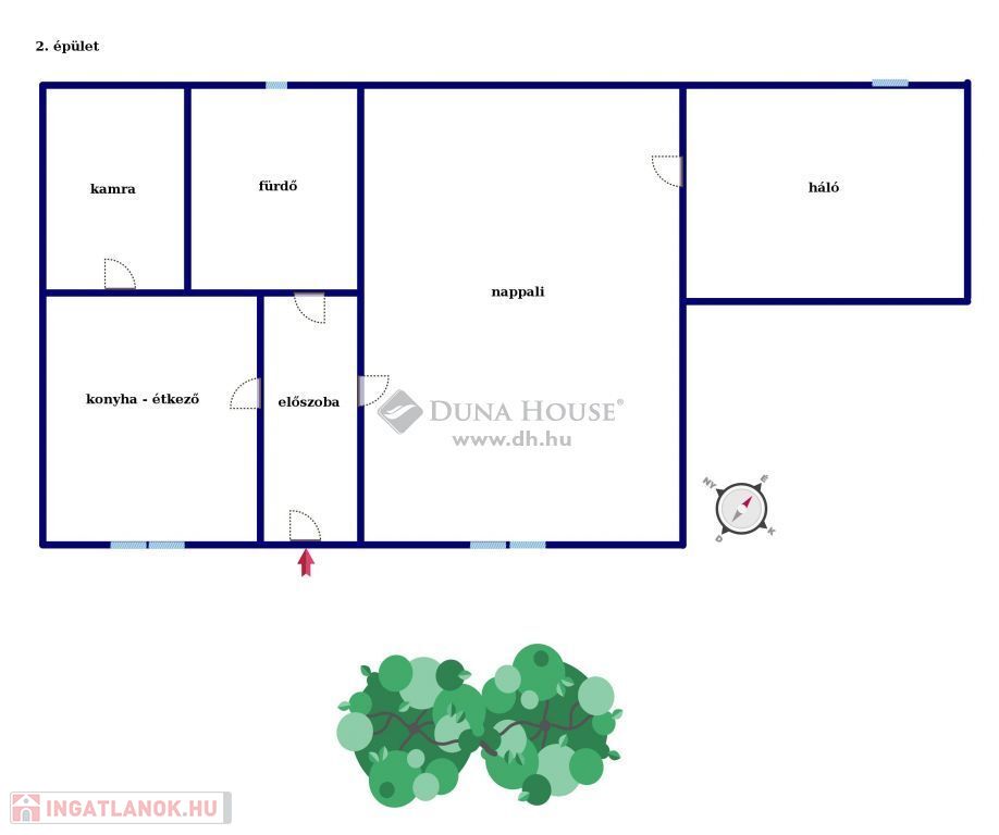 Térfelosztása az alábbi: nappali, háló, konyha-étkező, kamra, fürdő- és előszoba.