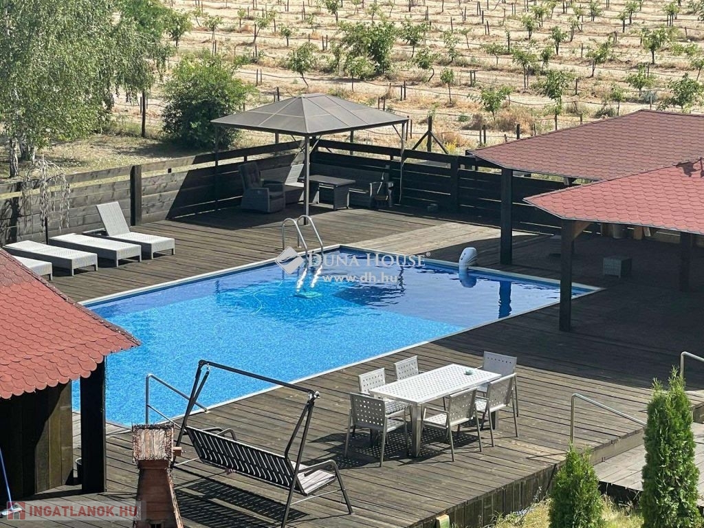 Külön exkluzív medencetér, pihenővel található. A medence vízellátása 100 méter mély kútból történik. Tisztító berendezéssel, napelemes fútéssel rendelkezik. A medence körülötti rész fával burkolt. Fedett külső, extra minőségű konyhával, zuhanyzórésszel és napozóterasszal kialakított. A medencetér 22 X 16,5 méter. A medence 12 X 6,5 méter területű, mely ellenáramű rendszerrel és világítással rendelkezik.