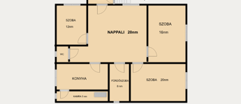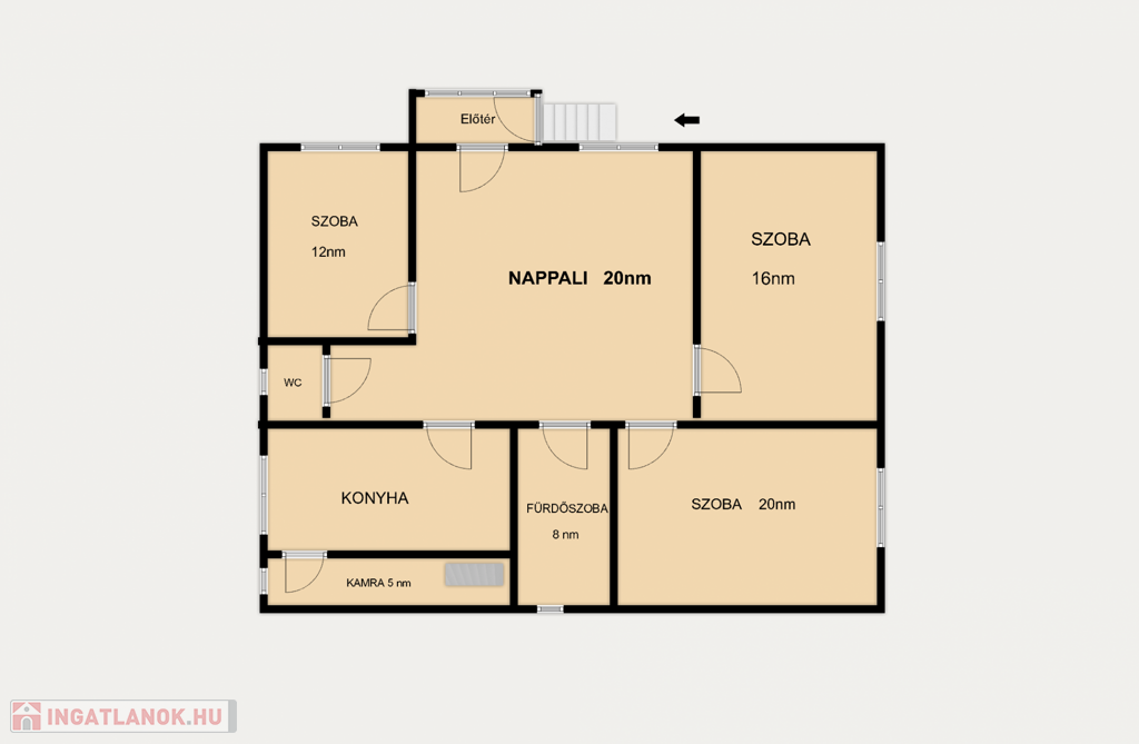 A ház mellett elhaladva érkezünk az előtérbe, ahonnan belépve a tágas, világos nappali fogad, ez a ház központi tere, ahonnan az összes többi helyiség nyílik: a két nagyobb, utcára néző szoba, a fürdőszoba, a konyha, egy külön wc, és a kisebbik szoba.A konyhához egy kamra is tartozik, innen lehet feljutni az egész épület fölött elterülő padlásra.