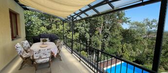Leányfalu egyik csendes, központhoz közeli utcájában eladó egy 2005-ös építésű, 2 független bejárattal rendelkező lakást magában foglaló családi ház: a kertkapcsolatos garzon az úszómedence szintjén a kertre néz, míg a garázs szintjén van a ház bejárata. Belső 2 szintes, rendkívül világos, napsütötte a ház. A tágas garázsban 1 autó fér el. Innen közvetlenül is bejuthatunk az előszobába. A földszinten mosókonyha, bejárható gardróbszoba, tágas fürdőszoba található, és az amerikai konyhás nappali előtt, az előszobából egy vendéglakrész nyílik még, saját fürdőszobával. A nappali keleti fekvésű, 27 nm-es fedett teraszán egy étkező- és egy ülőgarnitúra is kényelmesen elfér. A nappaliból megközelíthető felső szinten 3 tágas hálószoba és egy óriási fürdőszoba található, masszázskáddal és zuhanykabinnal, bidével. Az egyik hálószobából itt is egy hatalmas, nyugati fekvésű, fedett terasz teszi kellemessé a délutáni pihenést. A ház műszakilag folyamatosan karbantartott! Az ablakok jó állapotú fa nyílászárók, szúnyoghálóval ellátottak. Duplán rezsivédett a ház, a 2 önálló bejáratú lakrész miatt! A házban hűtő-fűtő klímák, cserépkályha és gázkazán, valamint a frissen telepített 5 kW-os napelem rendszer gondoskodik a szerény rezsiről. Az úszómedence 35 nm-es, ellenáramoltatós, műszakilag és esztétikailag kifogástalan állapotú, panorámás.
