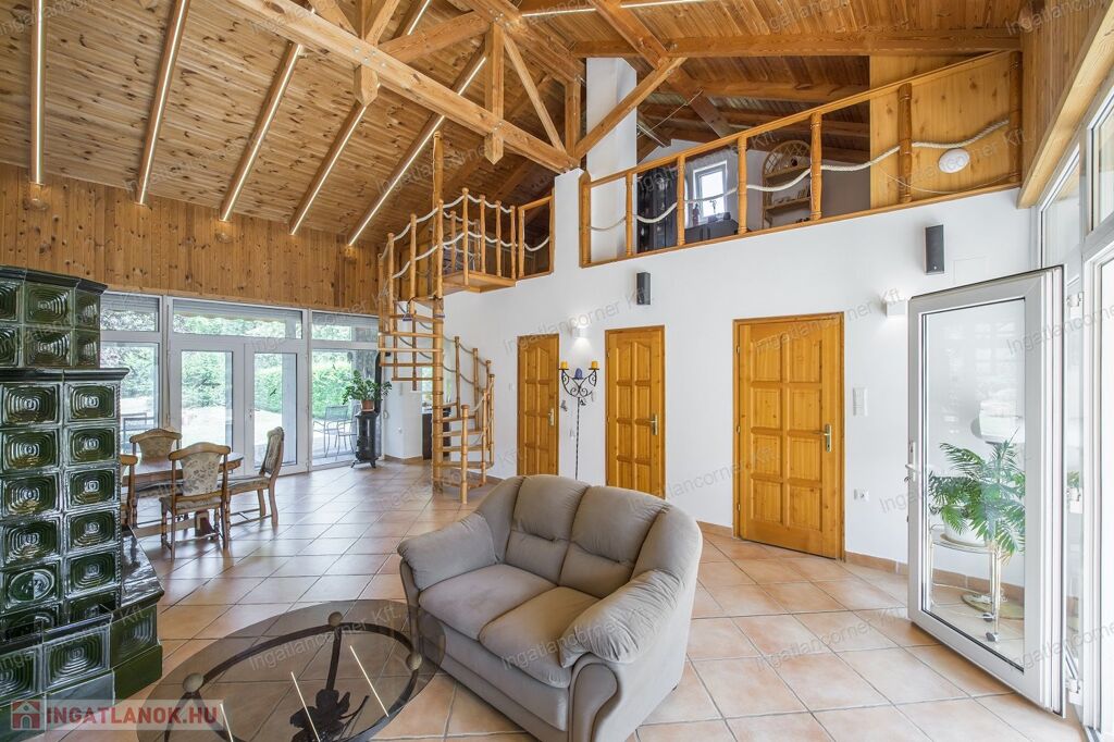 Az udvaron a medence mellett tovább haladva érkezünk a galériás főépületbe. A terméskővel kirakott homlokzatú főépületben fürdő, külön Wc, háló, nappali, étkező, konyha és a nappaliból elérhető tágas galéria kapott helyet. Az épületen átsétálva, a telek Duna parti része gyönyörűen parkosított, szalonnasütővel és díszburkolattal tarkított valamint vakond-hálóval ellátott. A kertben lett kialakítva a 45 m2-es borpince lejárója is, ami kivételes hangulatúvá teszi az egész kertet.