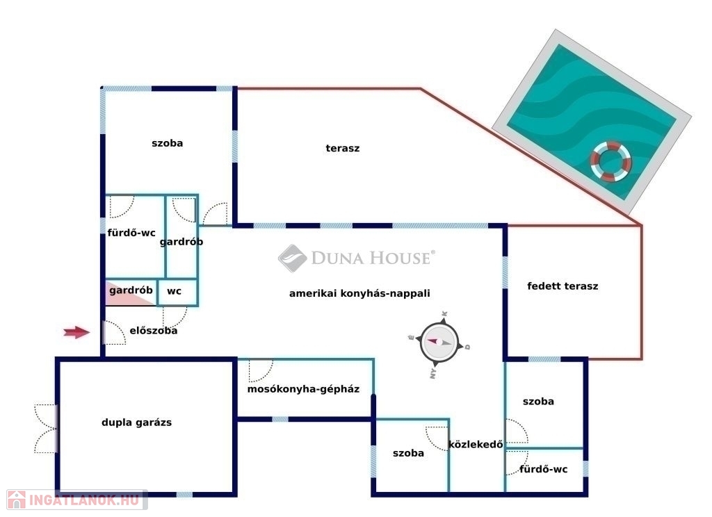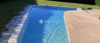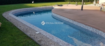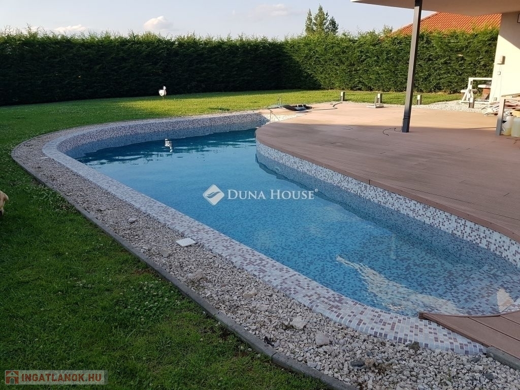 A telek rendezett, kerítéssel körbehatárolt, és tartalmaz egy 47 m³-es medencét napozó területtel, ahol a család és barátok kellemesen pihenhetnek. Az ingatlanhoz elektromos úszókapu biztosít kényelmes bejárást.