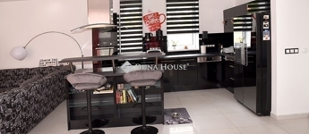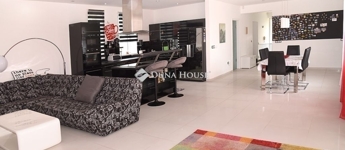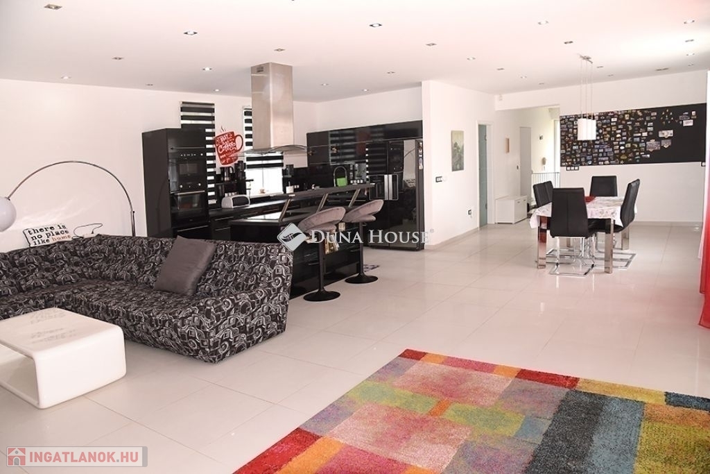 A belső terek elegáns, magas minőségű burkolatokkal és beépített bútorokkal rendelkeznek, amelyek a vételár részét képezik. Mindezek mellett egy 38 m²-es, kétállásos garázs is tartozik a házhoz, közvetlen átjárással a lakórészbe.