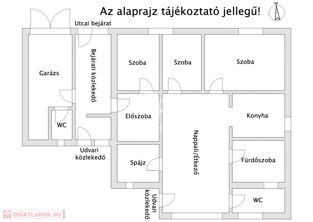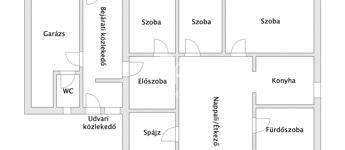 - Az egy szintes ingatlanba található: előszoba, 3 szoba, nappali/étkező, konyha, spájz, fürdőszoba, WC