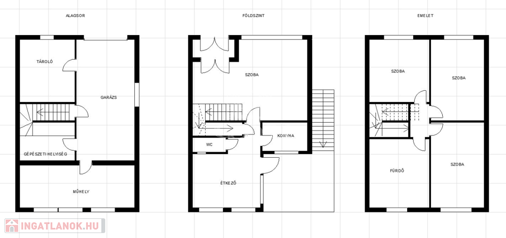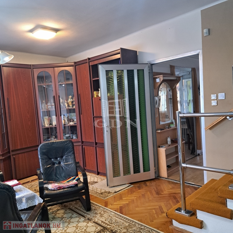 Innen nyílik egy nagyobb méretű szoba, valamint a konyha, mosdó-WC-vel és a lépcsőlejáró a garázshoz. A szobában található a kényelmes feljáró az emeletre, ahol a 3 további szobába és a szép tágas és felújított fürdőszobába jutunk.