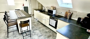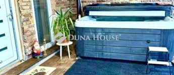 A ház mellett került megépítésre egy külső lépcső, mely felvezet minket az emeletre. Itt is található egy az udvarra néző 20nm tetőtéri terasz. A bejárati ajtaja és ablakai az emeleti lakásnak szintén műanyagok már. Belépve az ajtón egy tágas, napfényes amerikai konyhás nappalis kialakítás kapott arcot 2024-ben. A nappaliból nyílik egy hálószoba és egy zuhanyzós fürdőszoba. A nappali nagyságából adódóan szükség szerint még egy kis szoba kialakítható akár. Emeleti belmagasság 2,36m.