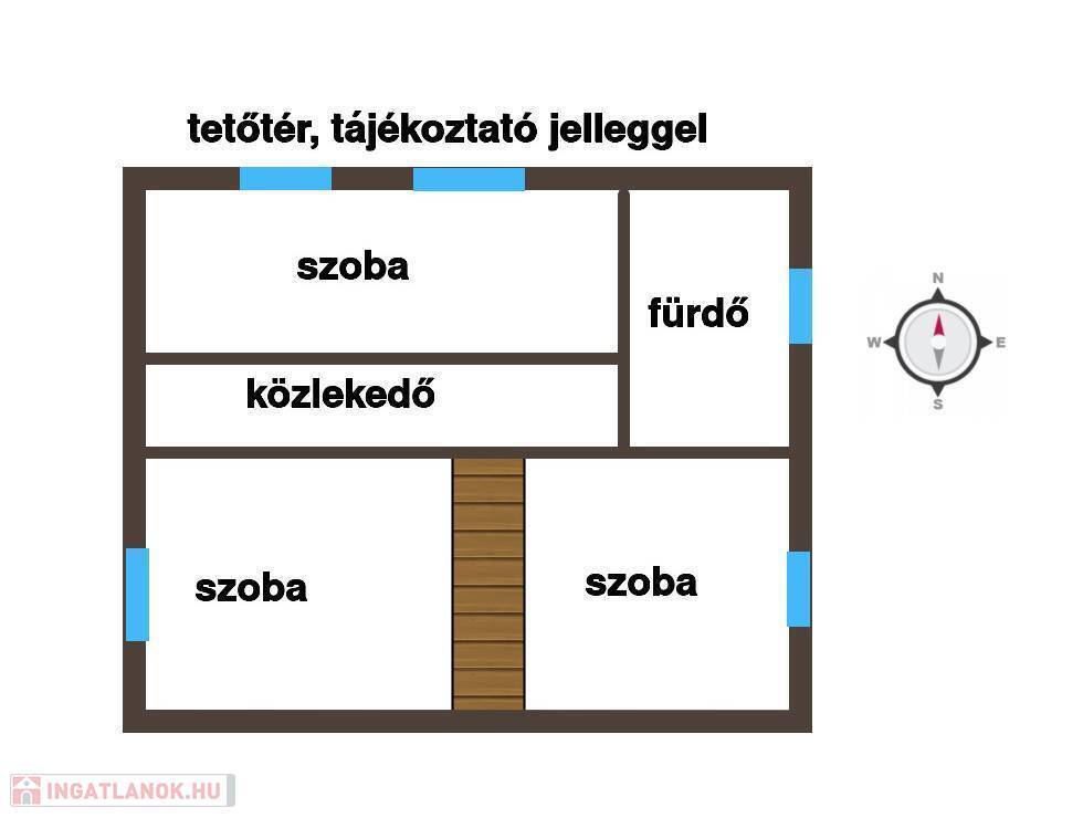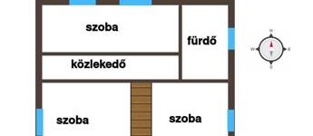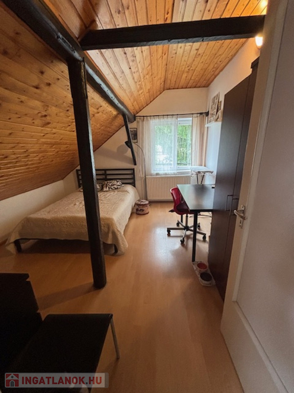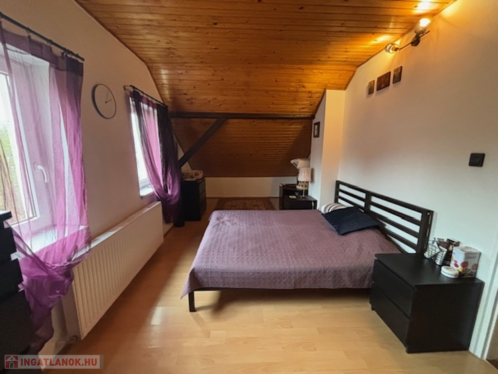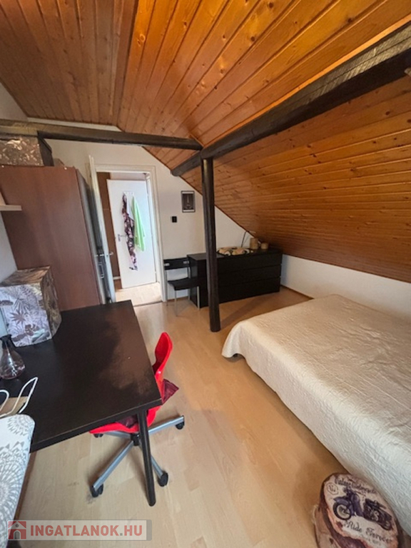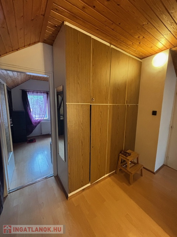 Emelet: A tetőtérben három külön nyíló hálószoba (két kisebb és egy tágasabb), egy második fürdőszoba és egy praktikus gardróbhelyiség kapott helyet.