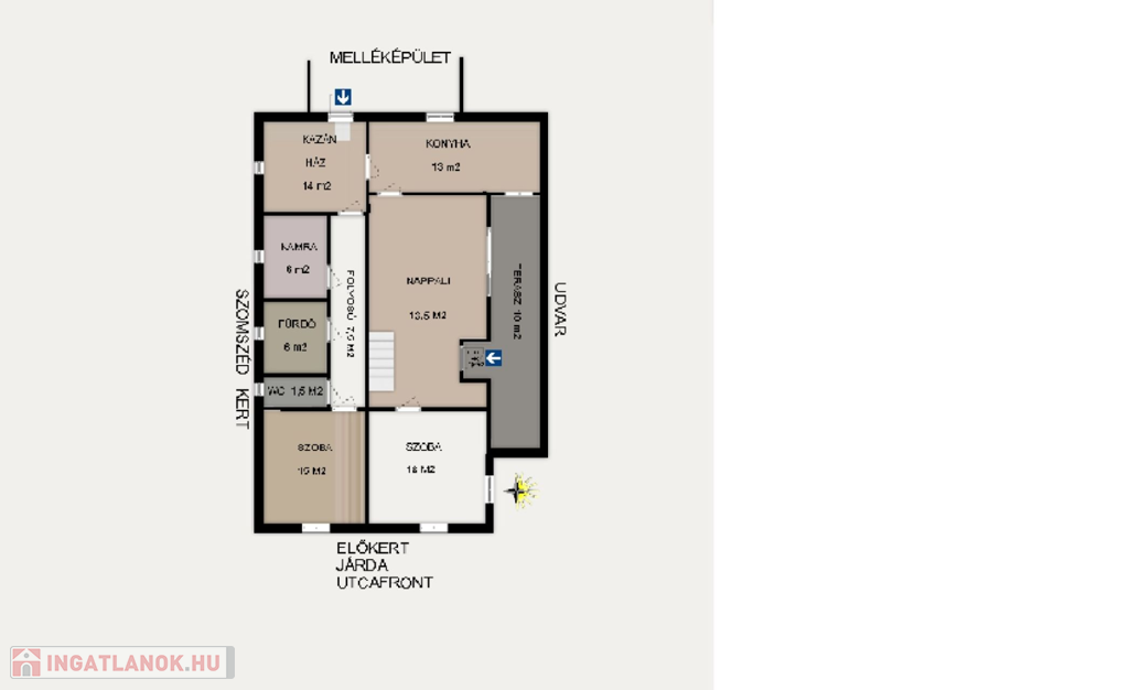 1 nappali, 2 szoba, 1 konyha, 1 fürdő, 1 külön WC, 1 kazánház, terasz