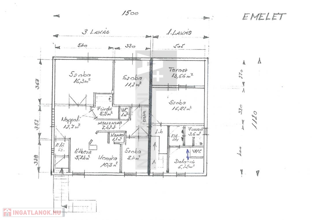 III. lakás: Tetőtéri 74,6 m2. Három szoba, konyha – étkező, kamra, fürdőszoba, külön álló WC és egy szélfogó.
