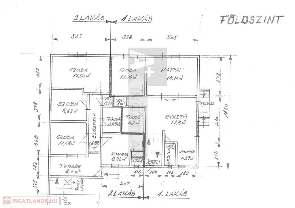 I.lakás: 105 m2 +14,5 m2 terasz. Két bejárattal rendelkezik. Földszinten hálószoba, nappali, konyha-étkező, kamra, fürdő és különálló WC. Emeleten: egy szoba, fürdőszoba, különálló WC és egy kis dolgozó rész.