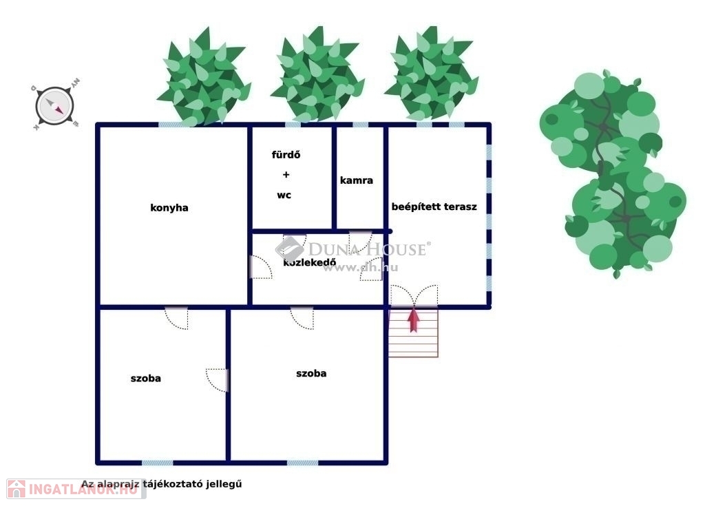 Helyiségek: 2 szoba, konyha, fürdőszoba és beépített terasz.