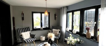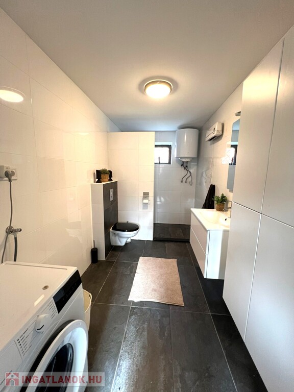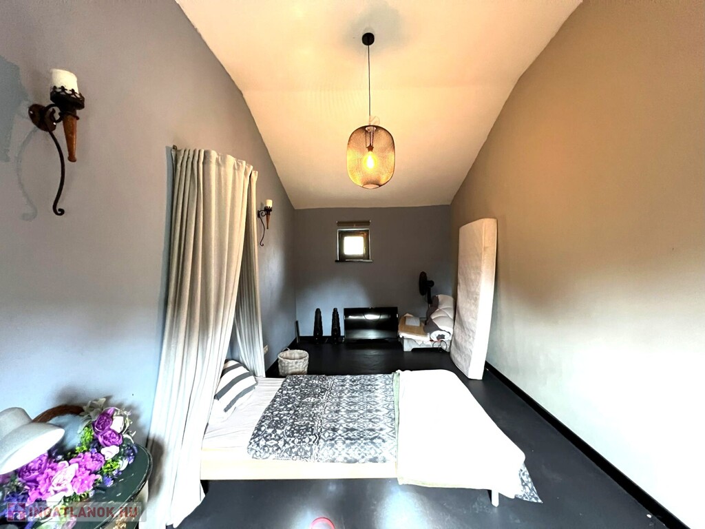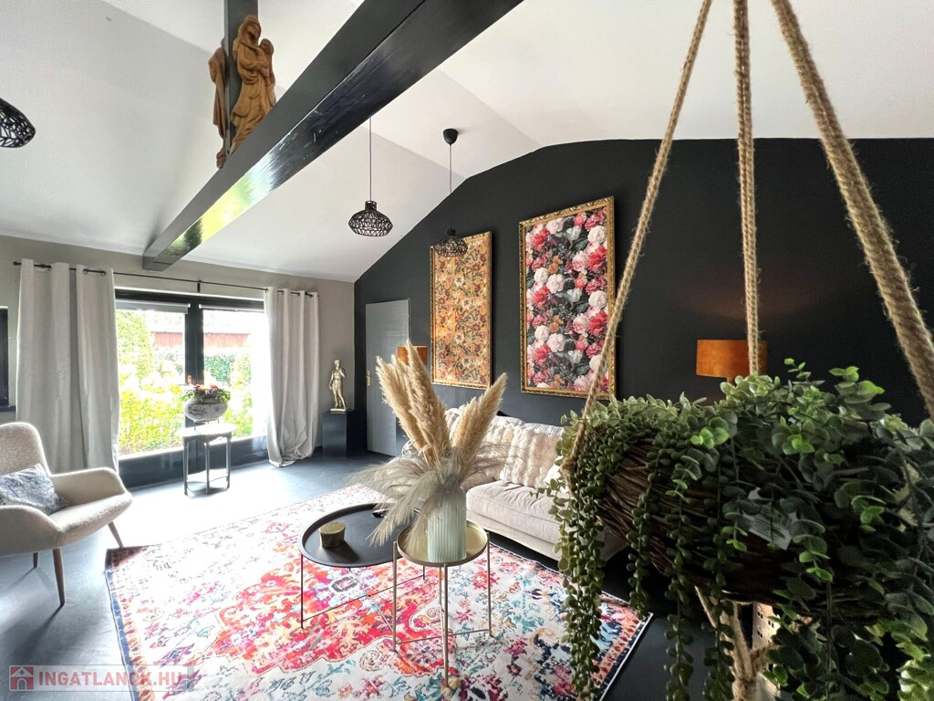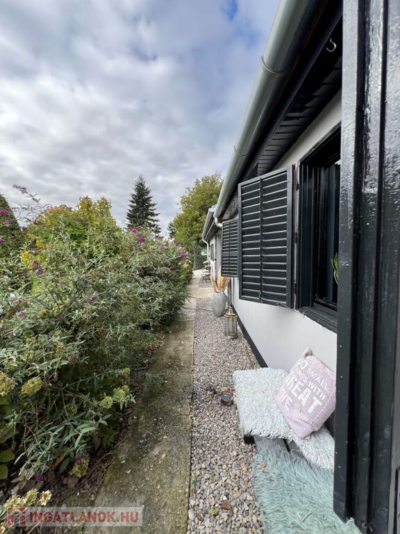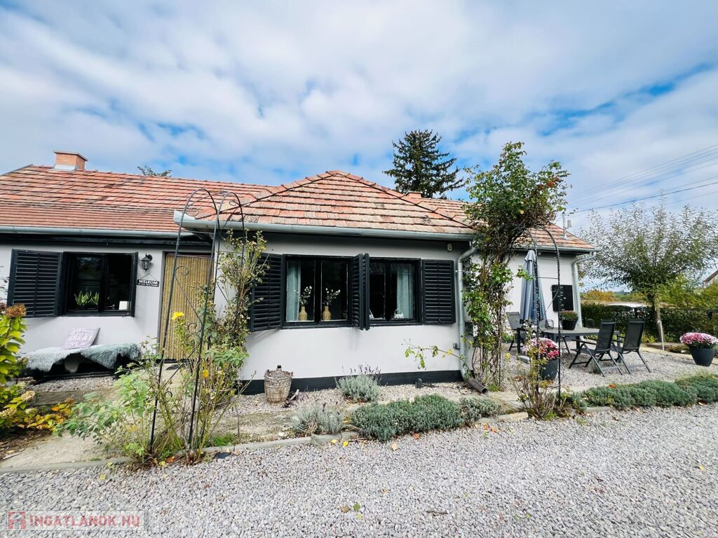 Az ingatlan jellemzői: A főbejáraton át egy világos közlekedőbe érkezünk, ahonnan minden helyiség könnyen megközelíthető. Innen jutunk el a fényes, jelenleg olvasótérként használt előszobába, amelyből nyílik a modern, gépesített konyha étkezővel, valamint az egyik barátságos hálószoba. A közlekedő másik irányába található a zuhanyzós fürdőszoba WC-vel, egy külön helyiség, amelyet most mosókonyhaként használnak, továbbá a nagy belmagasságú, rendkívül világos nappali, amely a ház központi tere. Innen közelíthető meg a másik, tágas és kényelmes hálószoba is. A fa nyílászárók tovább erősítik a ház természetes, otthonos hangulatát.