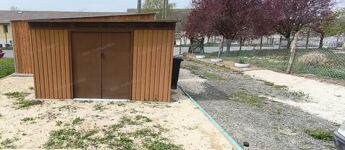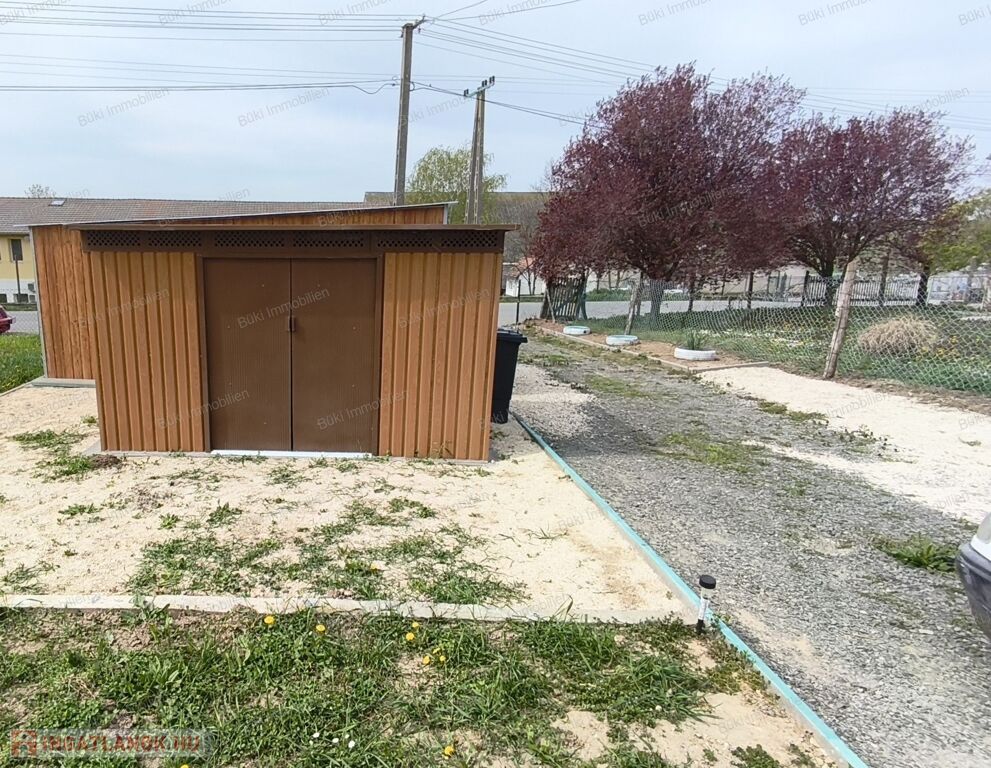 A telken mobilgarázs biztosítja a parkolást, valamint egy kerti tároló is helyet kapott, így a mindennapokhoz szükséges eszközök kényelmesen elhelyezhetők.