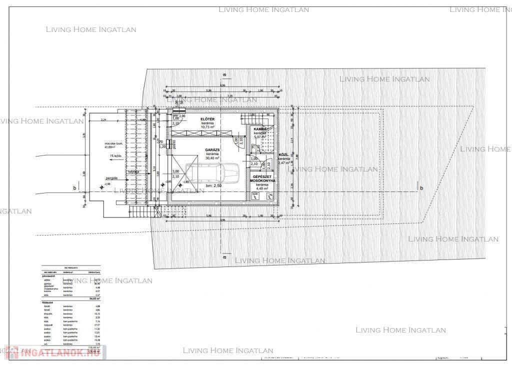 A pinceszinten/földszinten lett kialakítva a garázs + gépészeti helység, kamra, mosókonyha, előszoba.