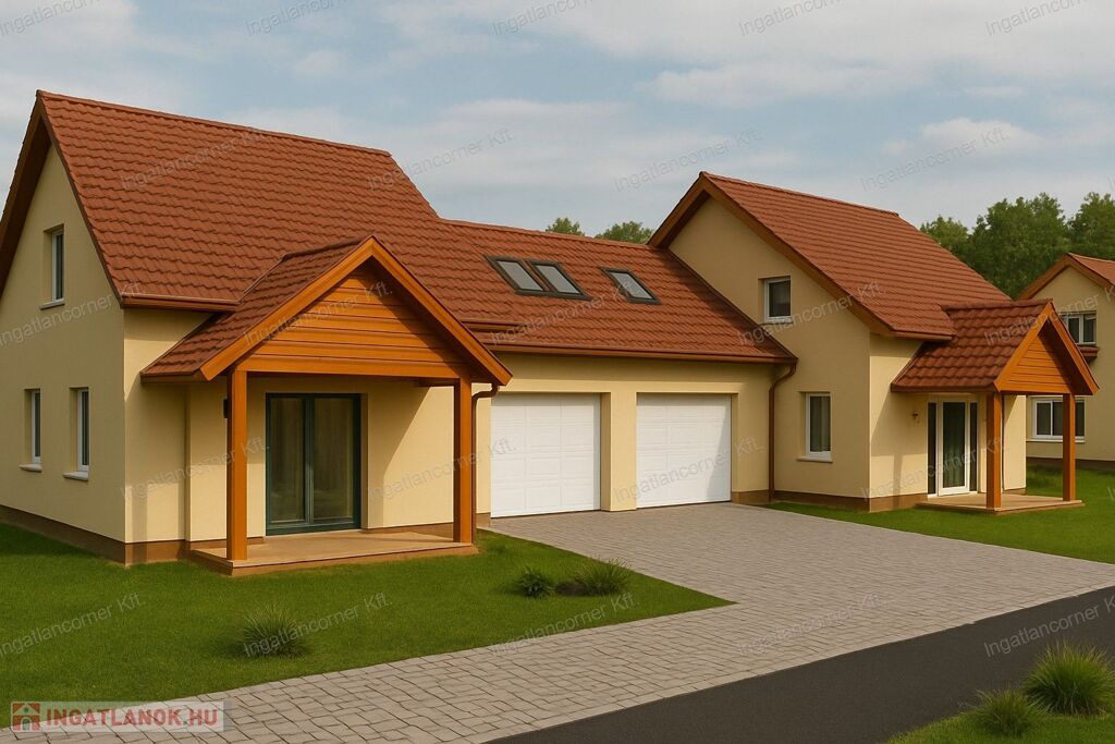 Mindegyik ingatlan 124,5 m2-es (+ fedett terasz 10 m2), nappali + 4 hálós, 2db fürdőszobás, gardrób helyiség, garázs (+21 m2)