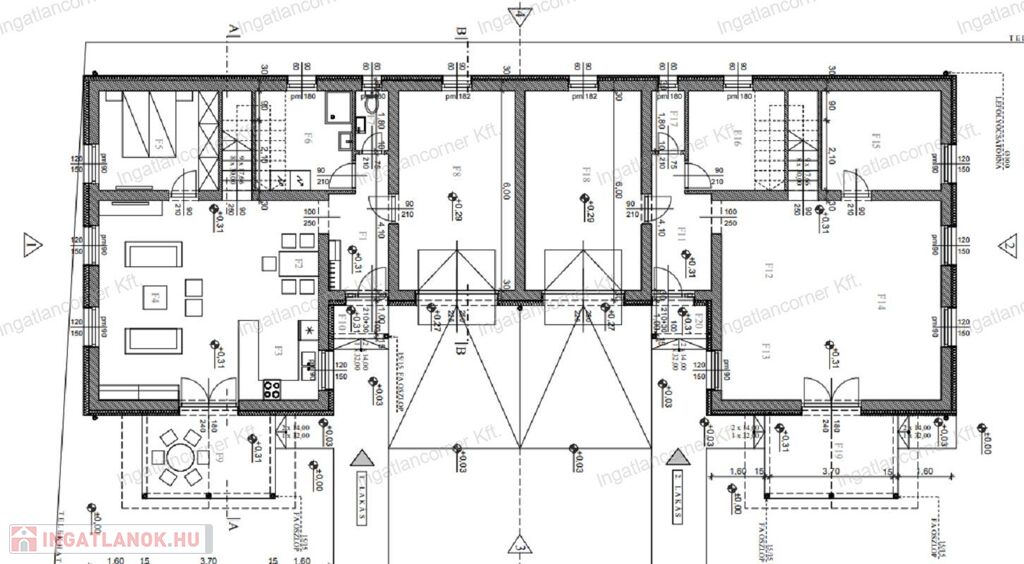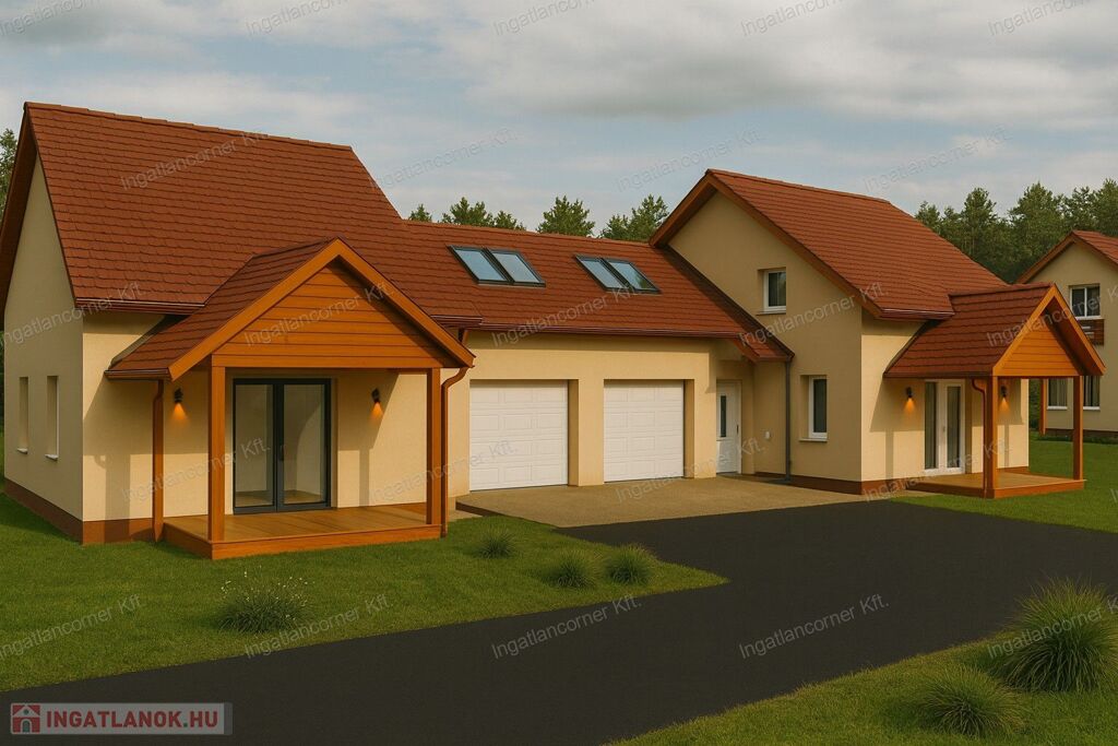 Mindegyik ingatlan 124,5 m2-es (+ fedett terasz 10 m2), nappali + 4 hálós, 2db fürdőszobás, gardrób helyiség, garázs (+21 m2)