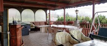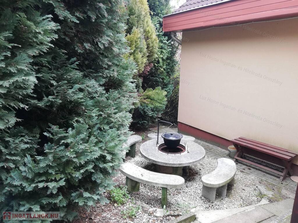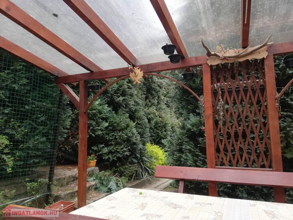 1000 m2-es telek, rendezett jó kerítéssel. 150 m2-es alapterületű ház, 4 emelettel, kerti kiülővel, sütögetővel, hatalmas terasszal amiről remek panoráma tárul elénk. A kertben hatalmas örökzöldek találhatóak ami még természetközelibbé teszi a kertet.