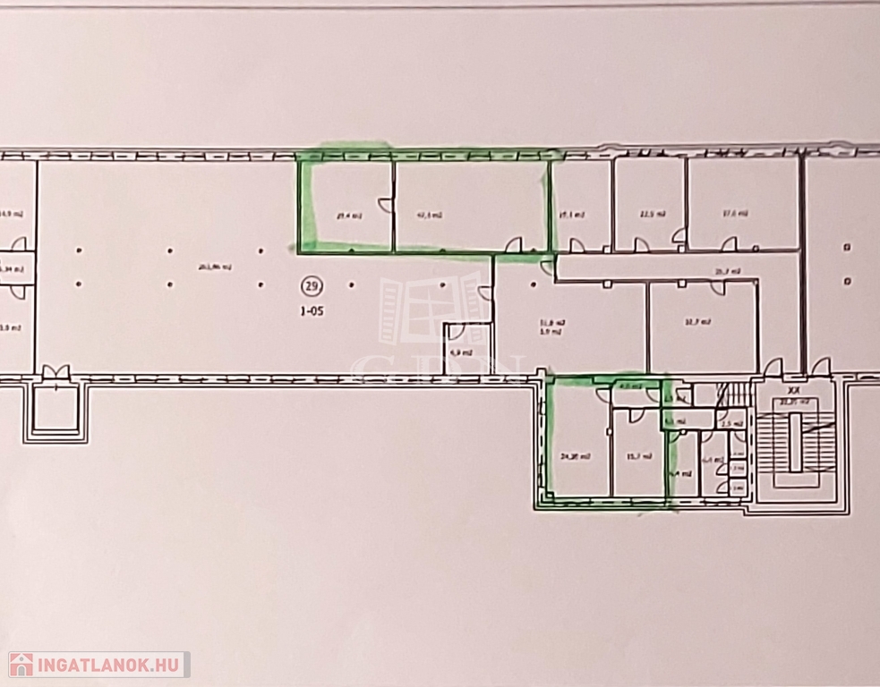 A modern, jó állapotú, klímával ellátott bérlemény, az irodaépület második emeletén helyezkedik el, melyet egy zárt folyosóról,és egy 8 nm-es közös területen áthaladva közelíthetünk meg.Két helyiségből áll, egy cc: 50 nm-es irodából és egy 30 nm-es tárgyalóból.