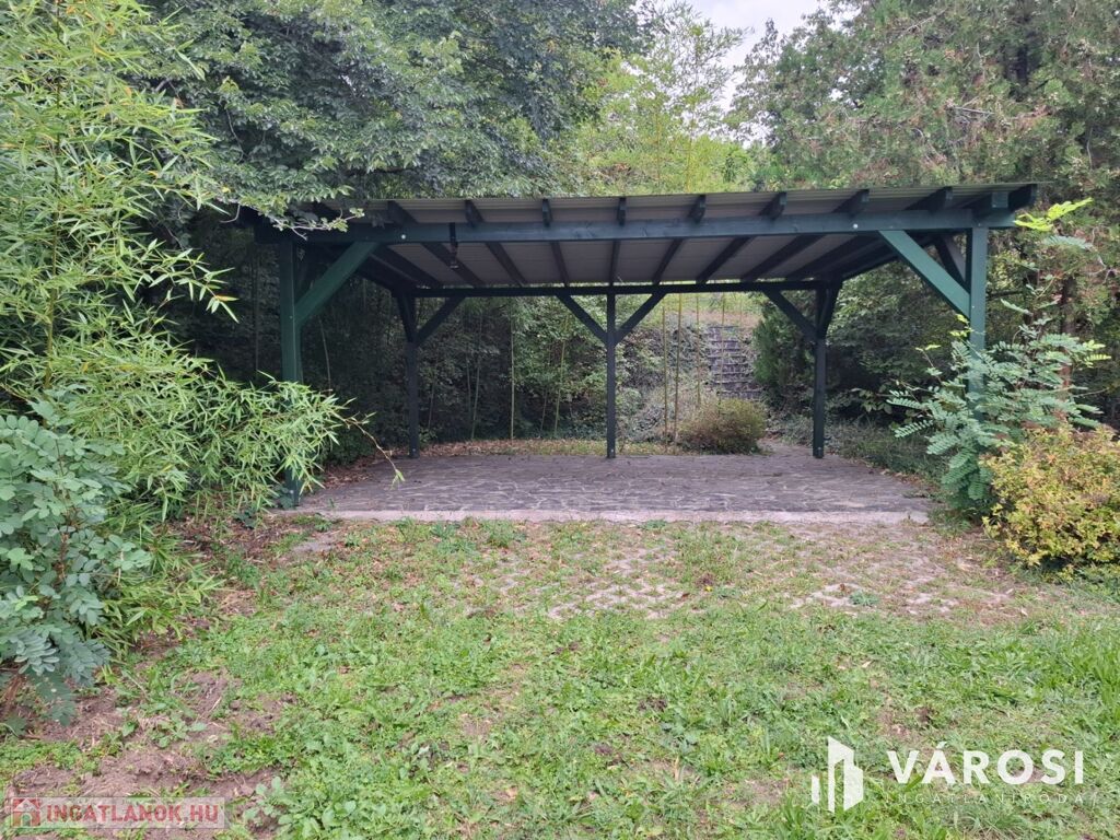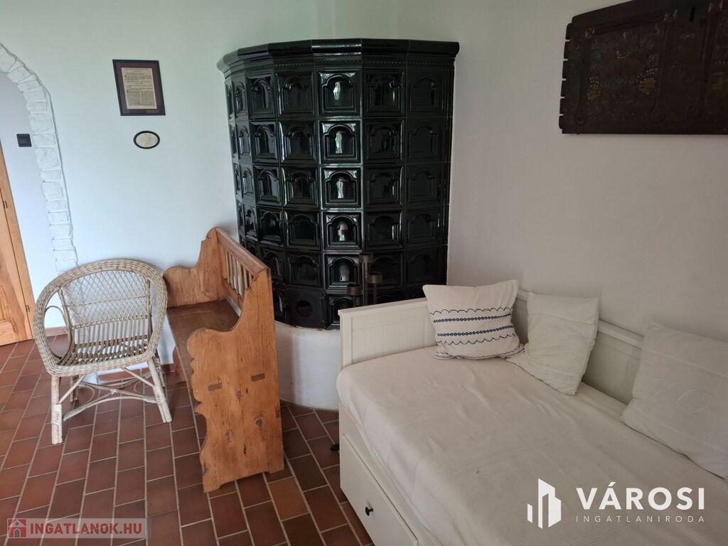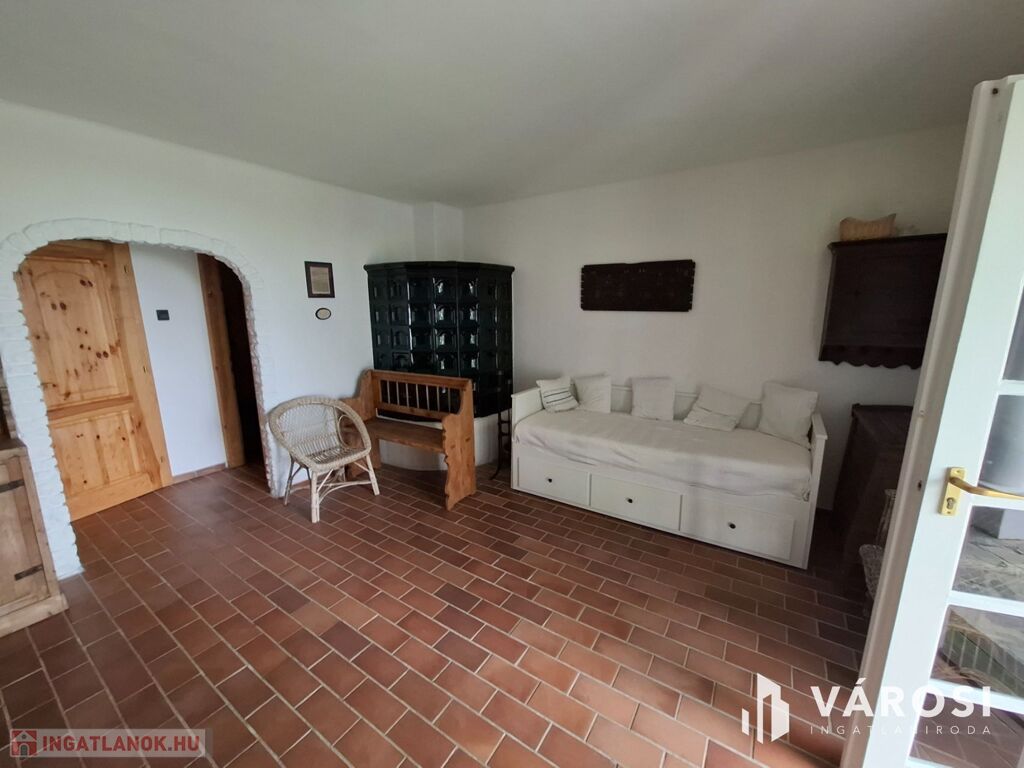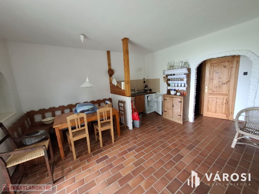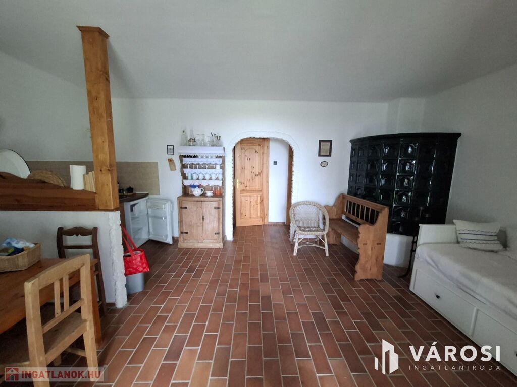 Az alsó részen fedett kocsibeálló, kerti sütő és pihenőterasz található; az épületben amerikai konyhás nappali, fürdőszoba és két félszoba van, cserépkályhával fűtve.