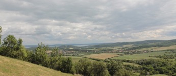 Balaton vízén túl rálátunk a déli part dombságaira és a völgyhídra is, lábunk előtt a Pécselyi dombság, a völgyben fekvő Kis Pécsely, Nagy Pécsely, az erdőben megbúvó Zádor vár romja.